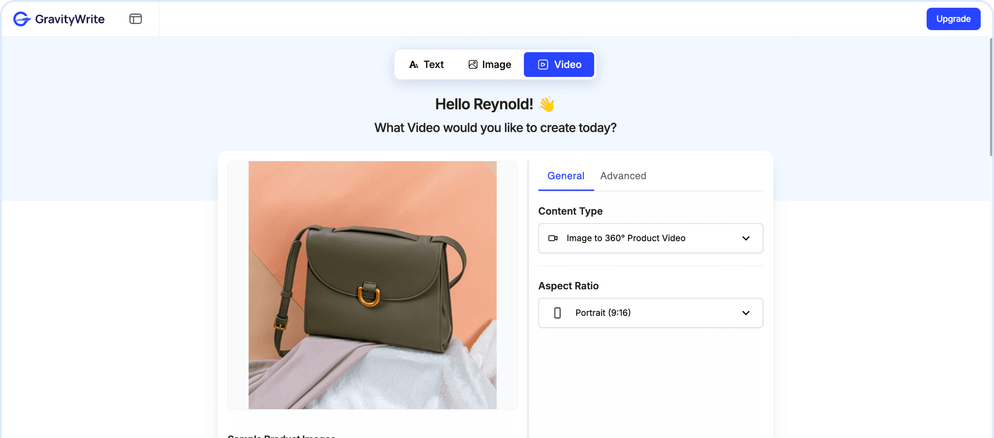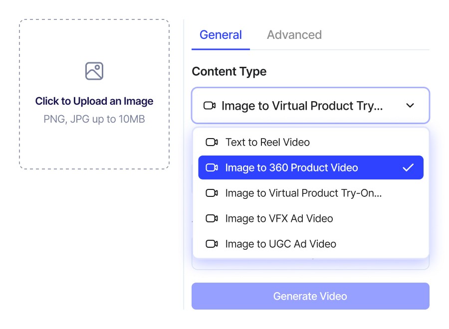 Select the “Image to 360° Product Video” as the video type. This feature allows you to create 360-degree rotating product videos.